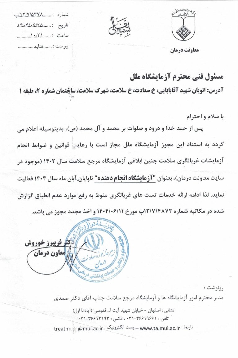 "دارای مجوز رسمی و تاییدیه مراجع ذیصلاح به عنوان آزمایشگاه مرجع غربالگری سهماهه اول و دوم بارداری با دقت تشخیصی بالا"